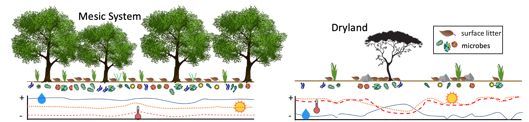 Differences between mesic and dryland decomposition are illustrated below. The surface litter distribution, moisture (raindrop), temperature (sun), and temperature are fairly even in the mesic site. As a result, microbes that decompose litter are evenly distributed. In the dryland example, the heterogeneously distributed vegetation and rocks alter the microclimate and microbes, likely altering decomposition patterns.